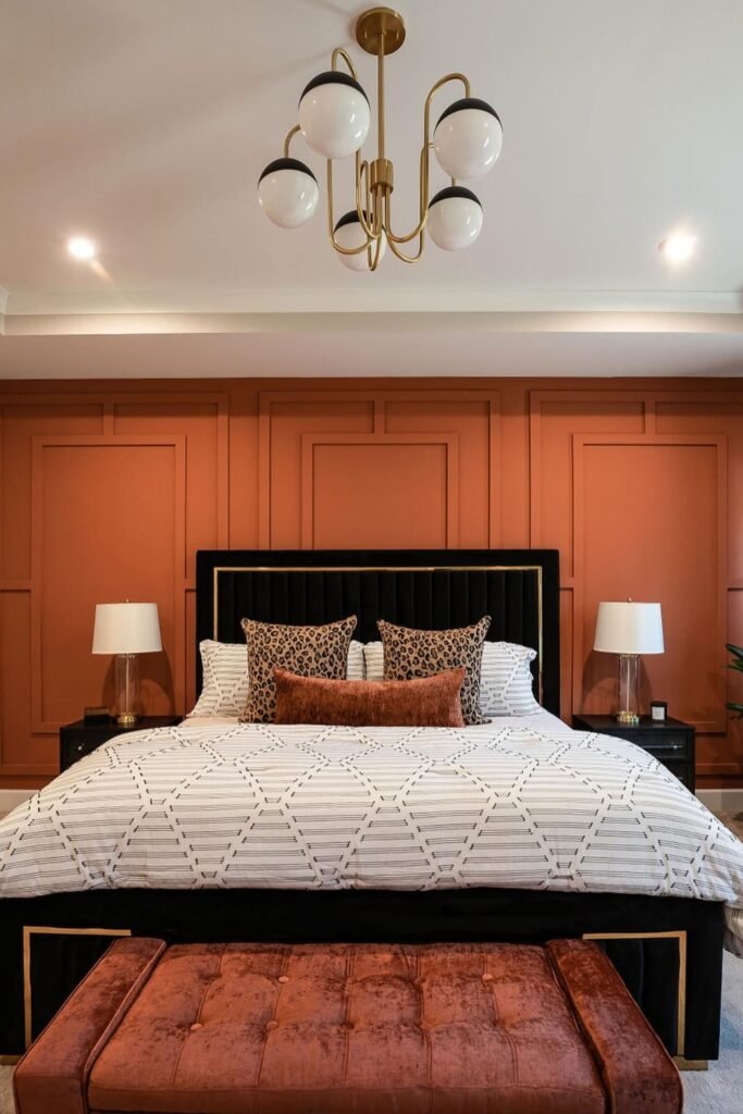 This warm luxe contrast accent wall adds instant richness and sophistication to the bedroom.