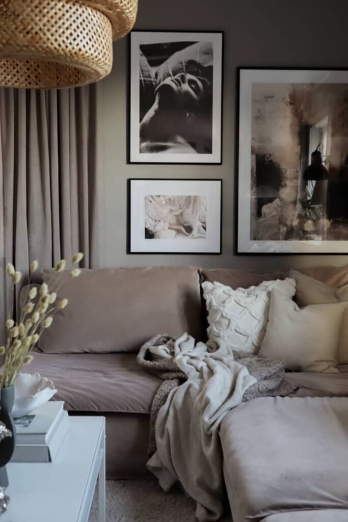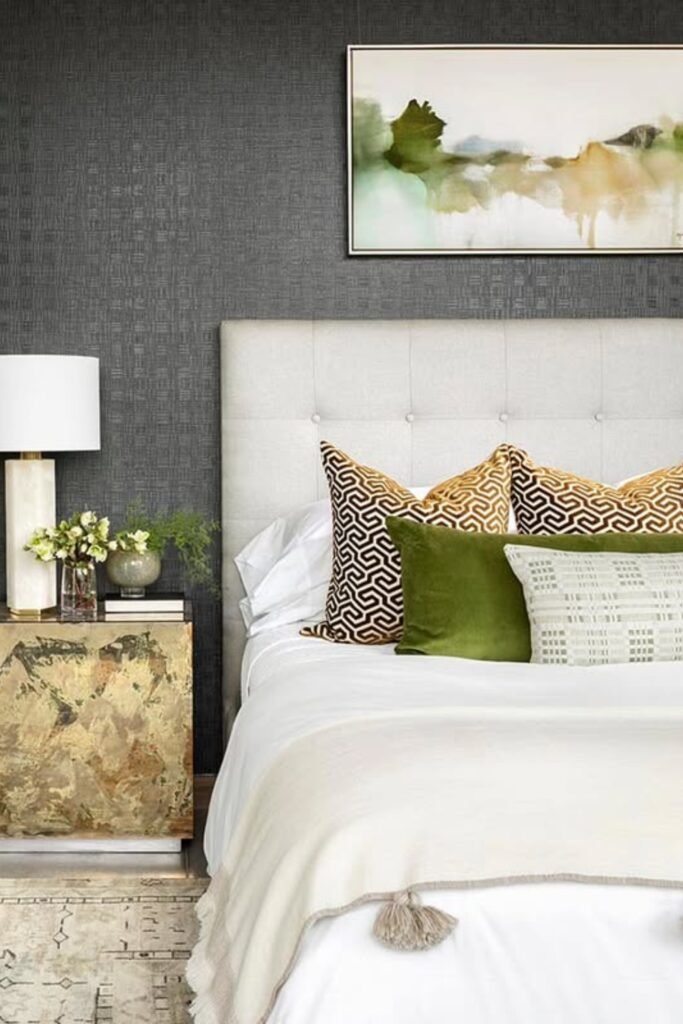 You can choose artwork in similar tones to your bedding, and hang the lowest piece close to the headboard so the wall decor feels anchored, not floating.
