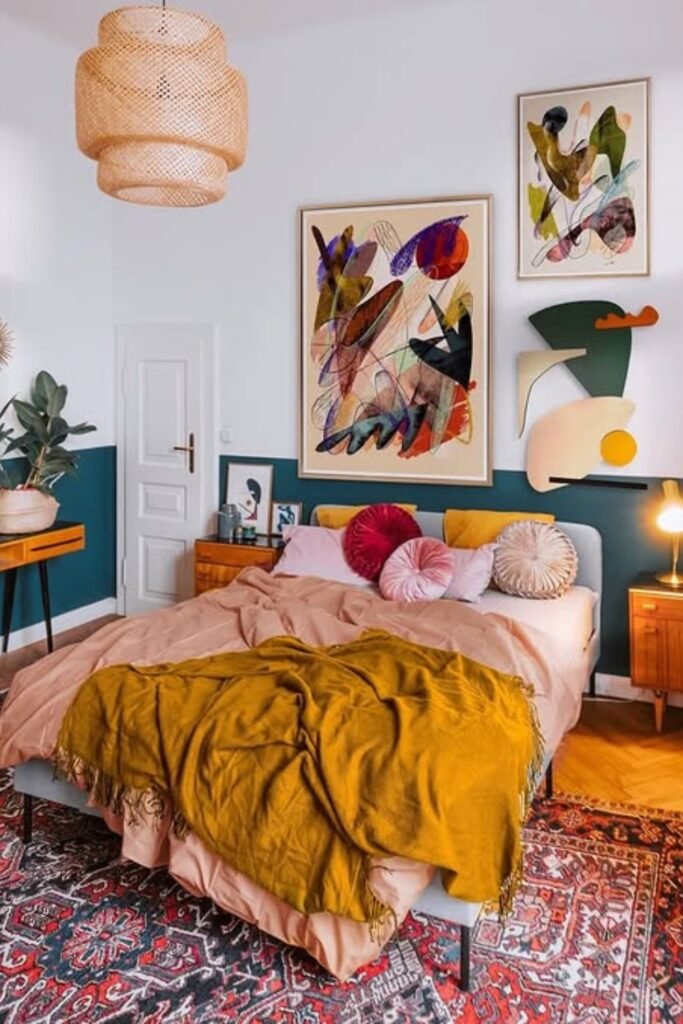 It works best in cozy, personality-driven bedrooms where color and objects tell the story.