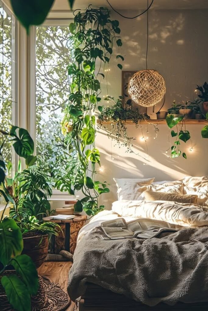This works best in airy, boho-style bedrooms where movement matters. You can keep the shelf light and let plants cascade naturally so the wall feels relaxed, not styled.
