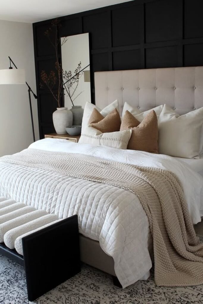 The dark wall helps your tufted headboard stand out instantly while the space still feels clean and balanced.