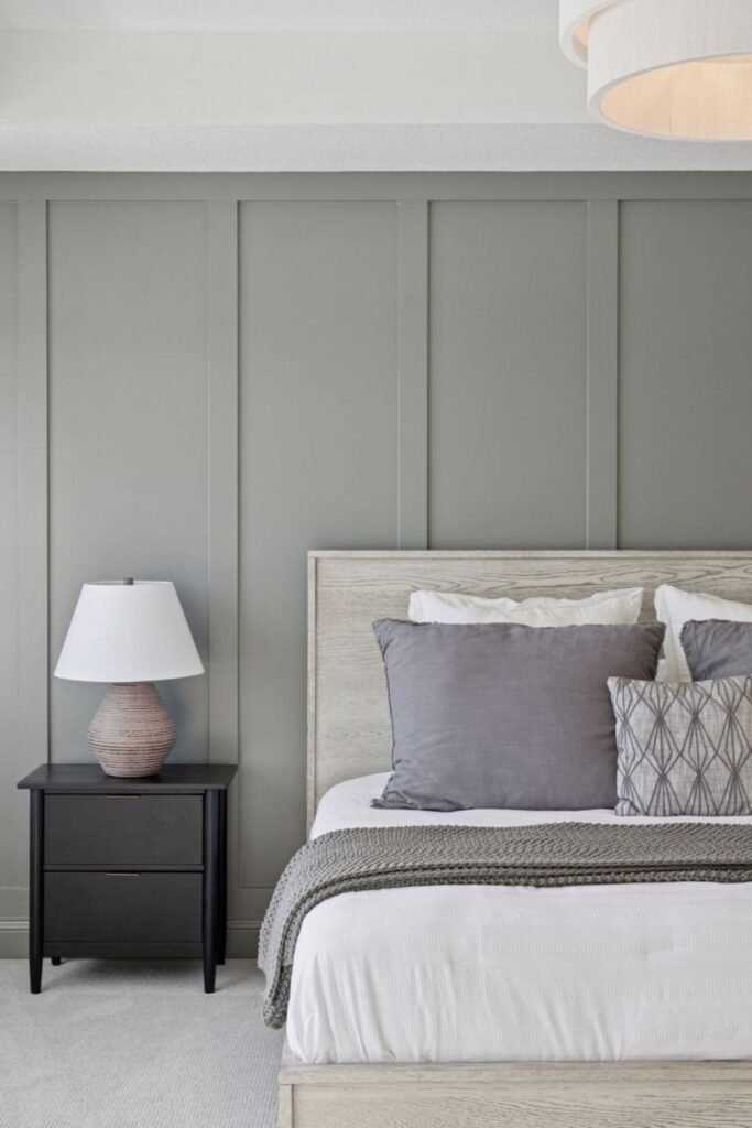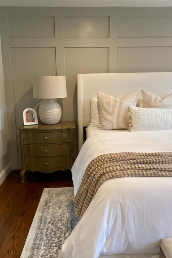 A greige grid wall is a smart choice when your bedroom already uses soft neutrals and you want more depth without darkening the space.