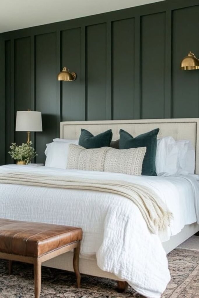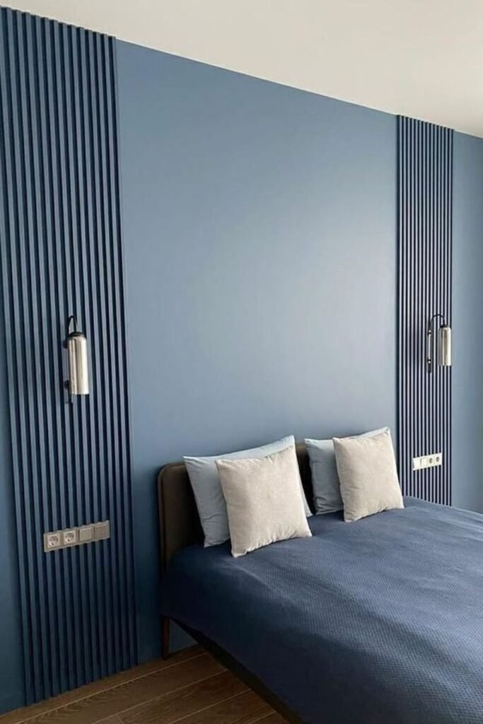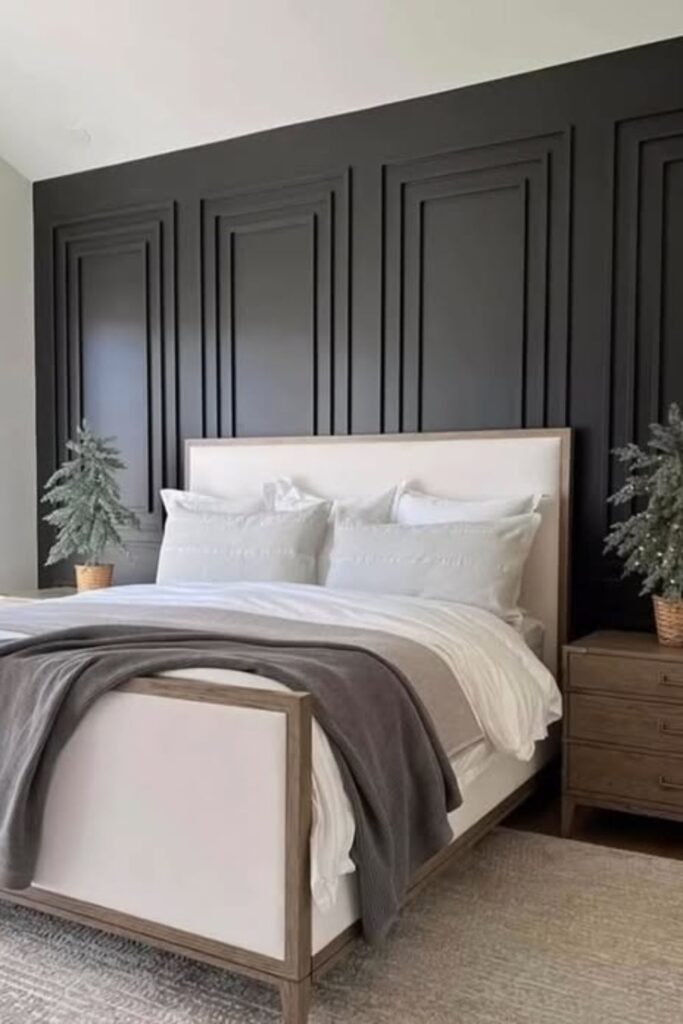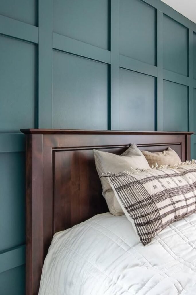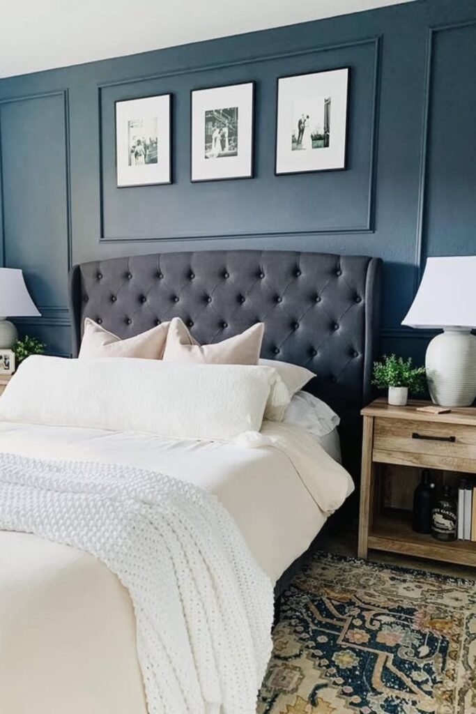 You can anchor your bed beautifully with a deep navy paneled wall, especially if you love clean, classic style.