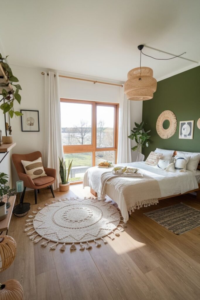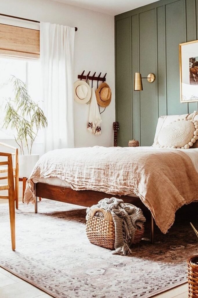 A muted green accent wall brings an instant sense of calm, especially in bedrooms with warm woods and natural textures.