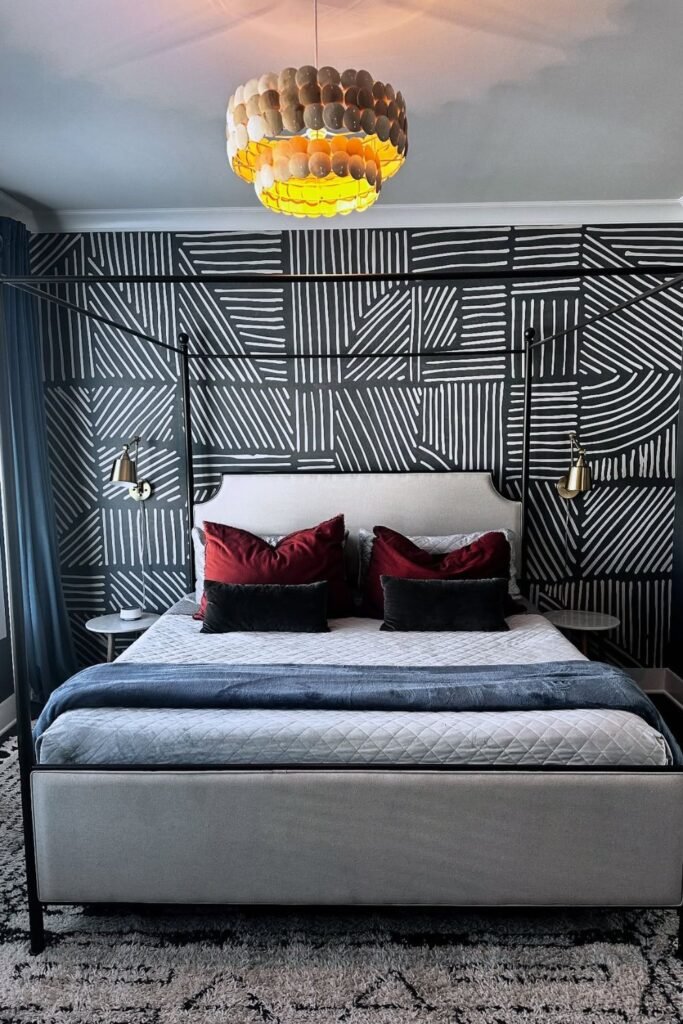 A bold black-and-white wallpaper instantly gives the room a standout moment, especially when the bed design is simple and needs a strong backdrop.