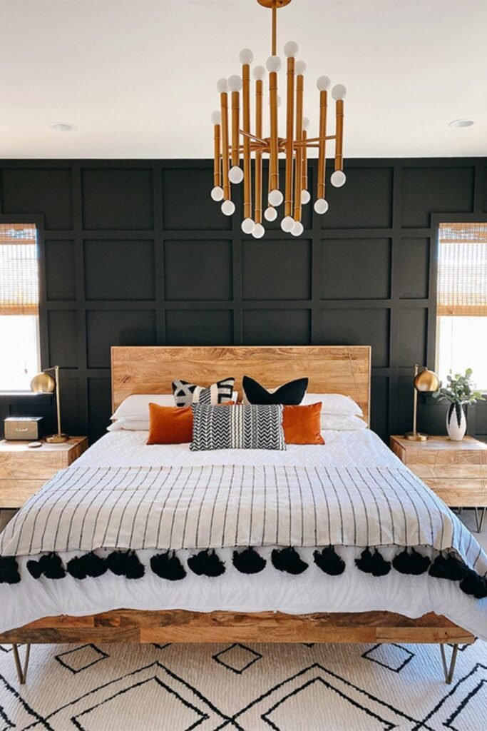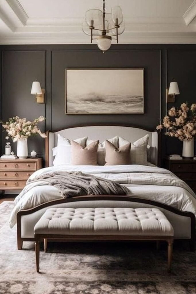 A deep charcoal wall creates instant richness, making neutral bedding and soft accents look more polished.