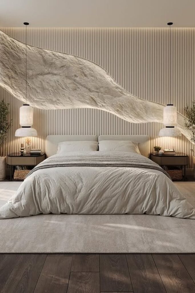 A sculpted wave accent wall adds gentle movement that makes the space feel relaxing and elevated.