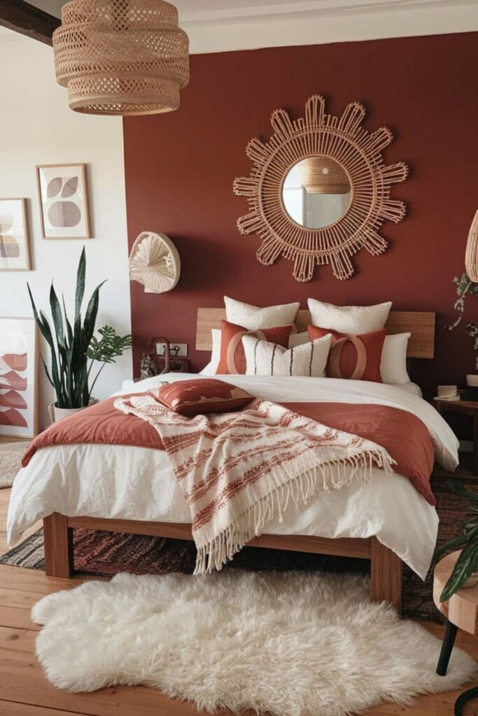 You can warm up your entire bedroom in one move: a deep terracotta accent wall.