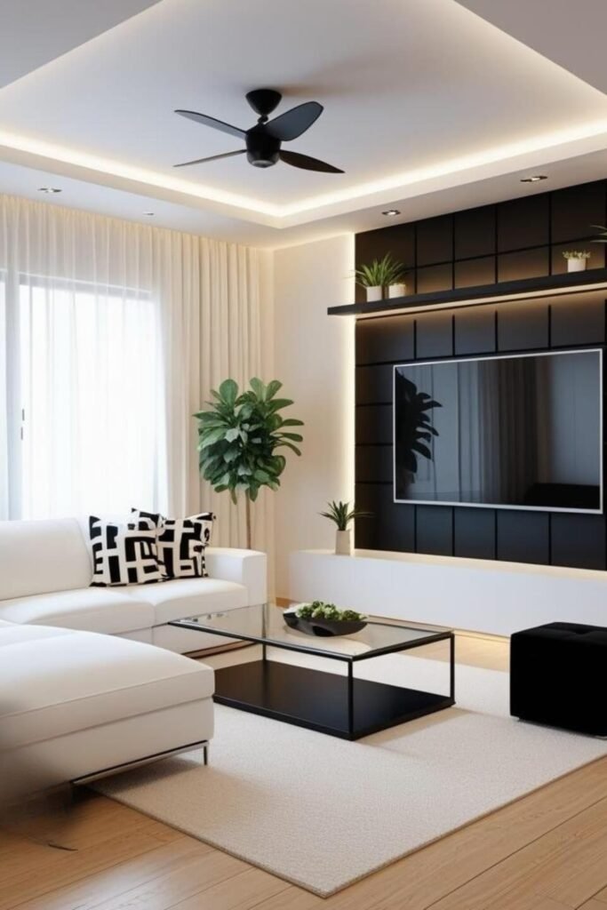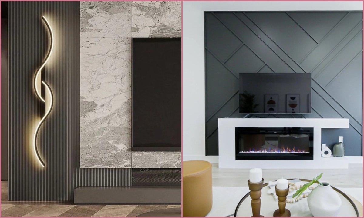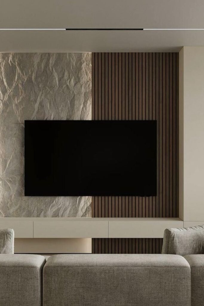 It splits the focus without chaos, letting the screen sit clean in the center. You can use this in modern living rooms where you want a bold media wall without heavy color.