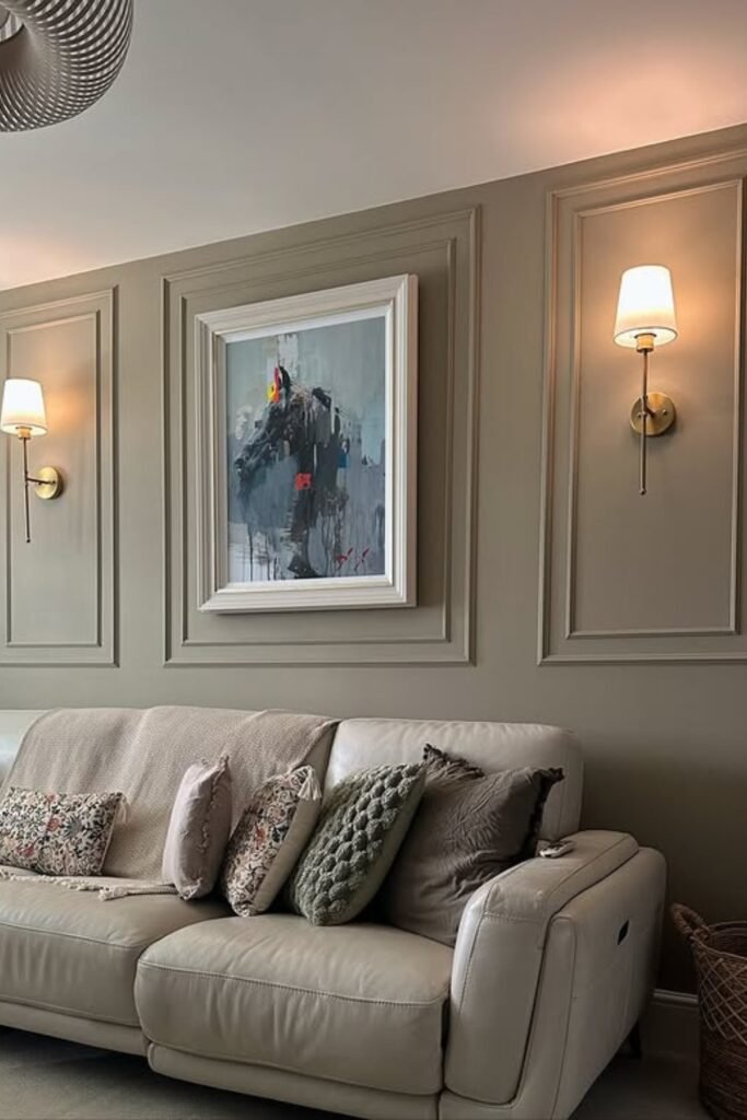 If you want your artwork to shine, you can let soft taupe panels quietly support it. The wall creates a calm base so bold art and warm sconces stand out without visual noise.