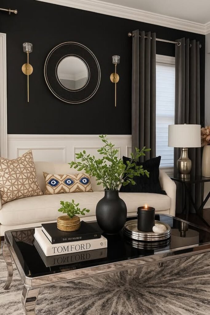 If the rest of your living room already leans dark, you can let a light accent wall create better balance and make the space feel more open.