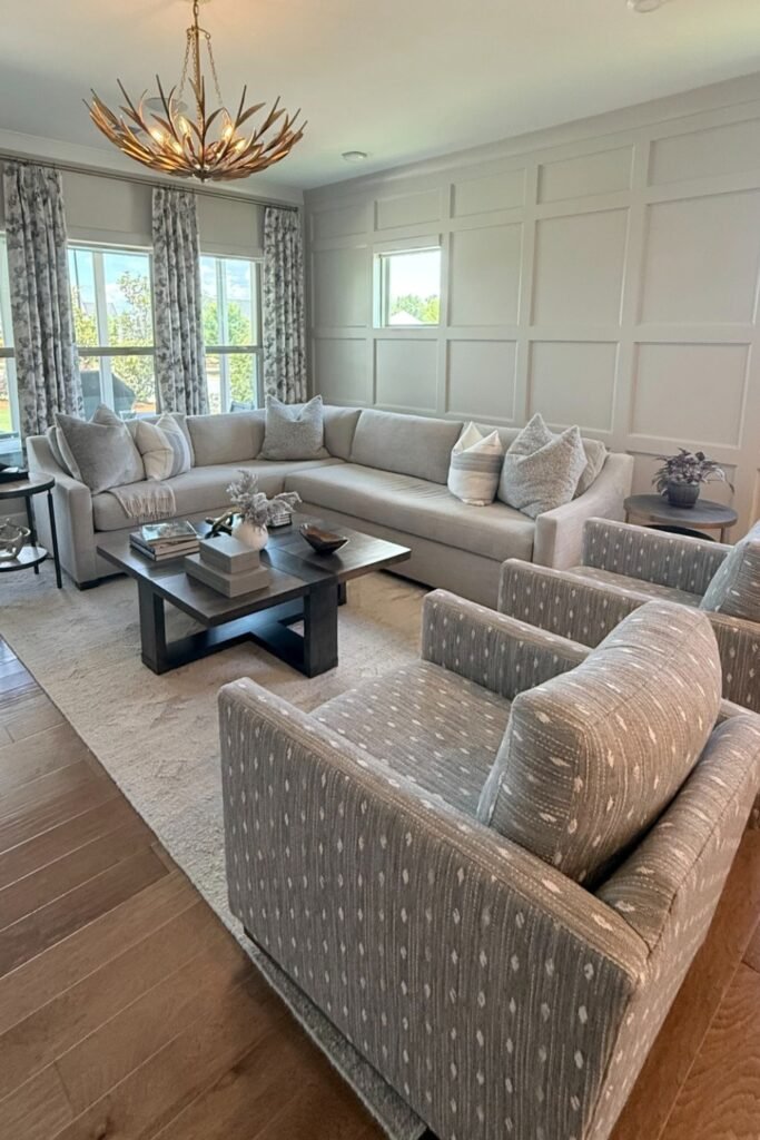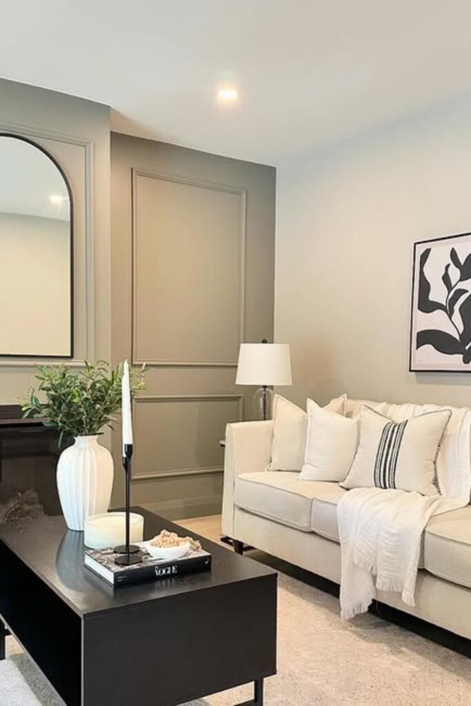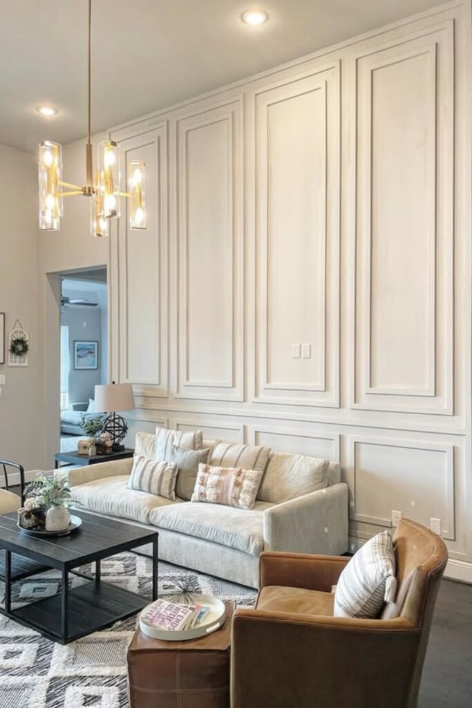 If you want a calm, polished space, you can let soft wall frames do the work. The accent stays subtle, so your sofas, art, and chandelier lead the mood instead of the wall.