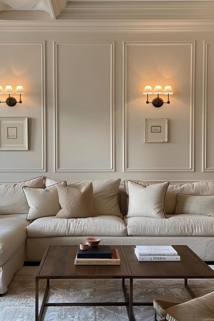 You can use this behind a formal seating setup where symmetry matters. You can recreate it with slim box molding, light warm paint, and one large artwork to anchor the center.