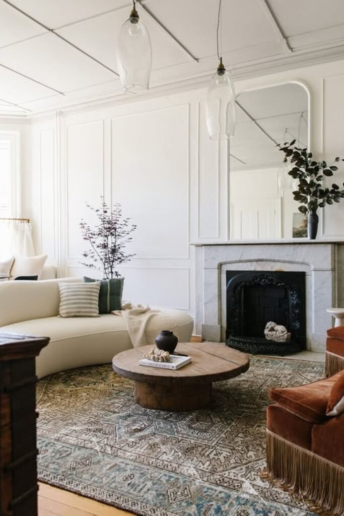 When you want the fireplace wall to be the heart of your living room, you can use soft paneling to do it quietly.