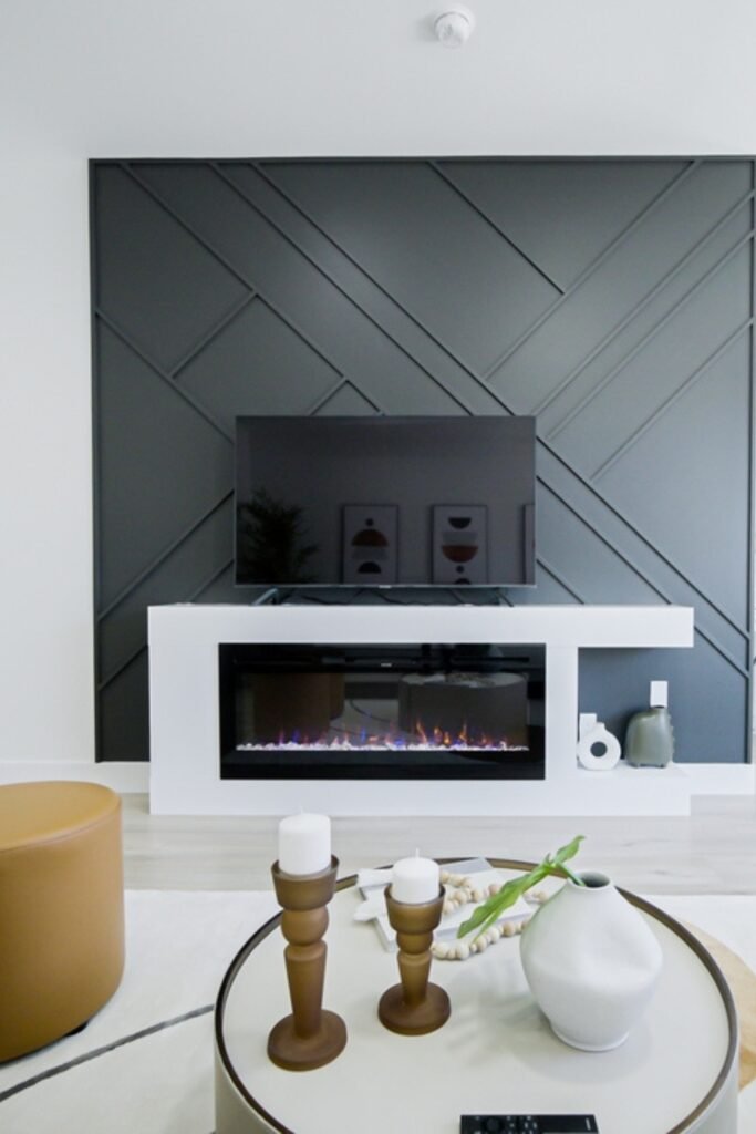 The deep charcoal paneling frames the TV and fire so cleanly that you can keep the rest of the room light and calm.