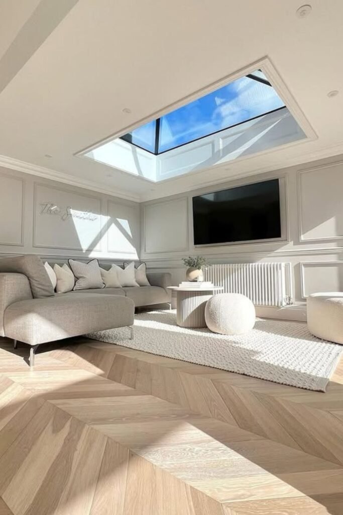 Your soft gray wall panels behind your seating area catch sunlight from the skylight, so the accent feels airy instead of heavy.