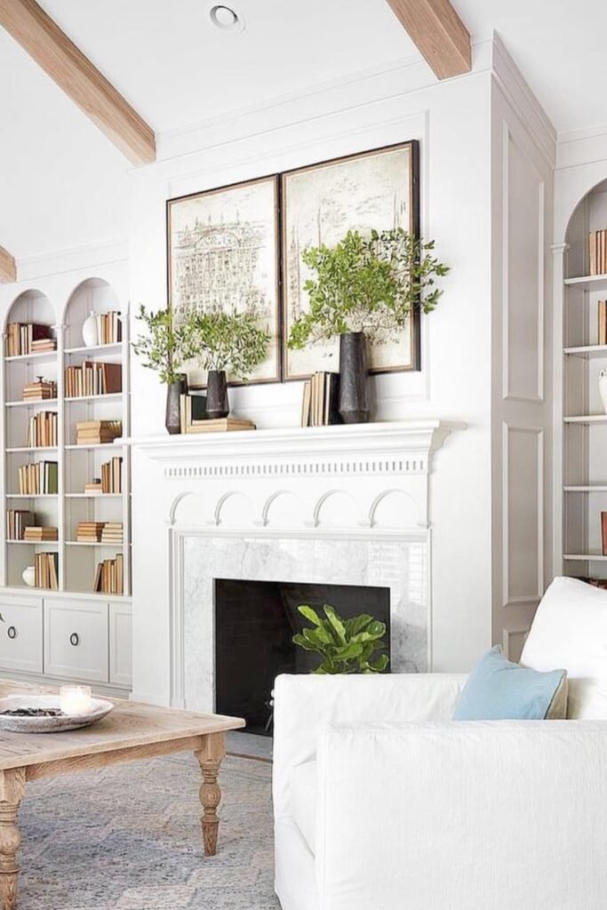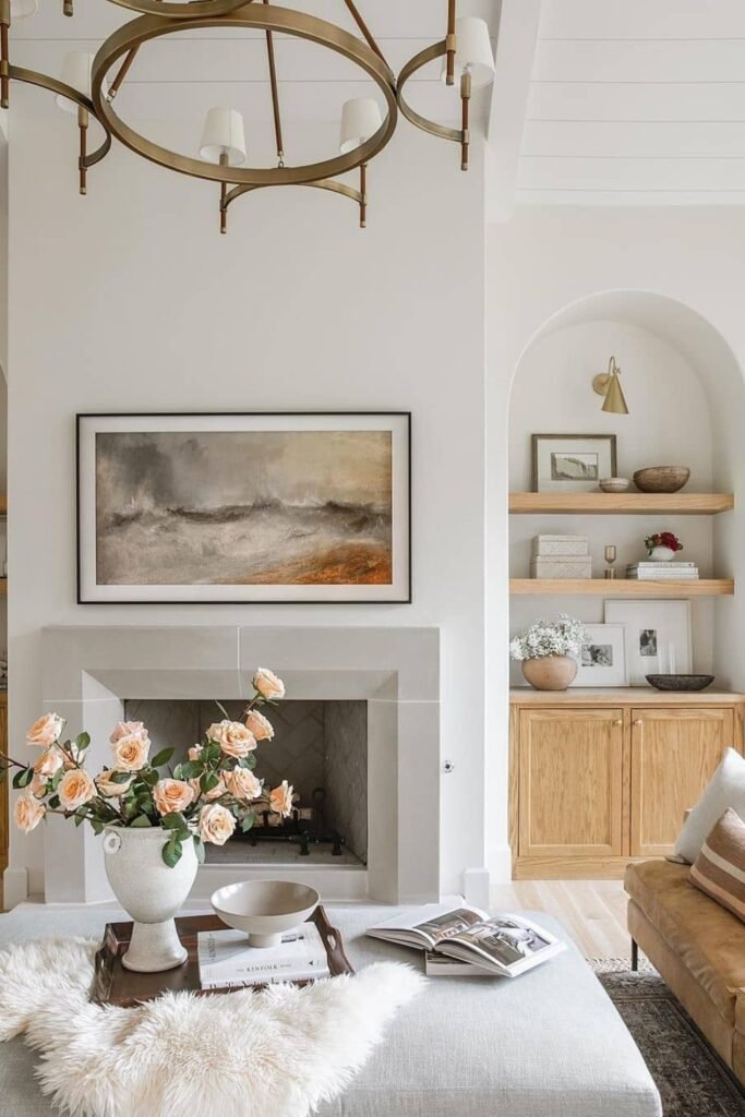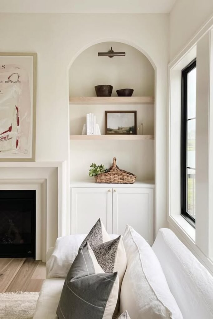 The marble fireplace adds a touch of sophistication, while arched shelving and woven accents bring warmth and balance, making the space feel both timeless and relaxing.