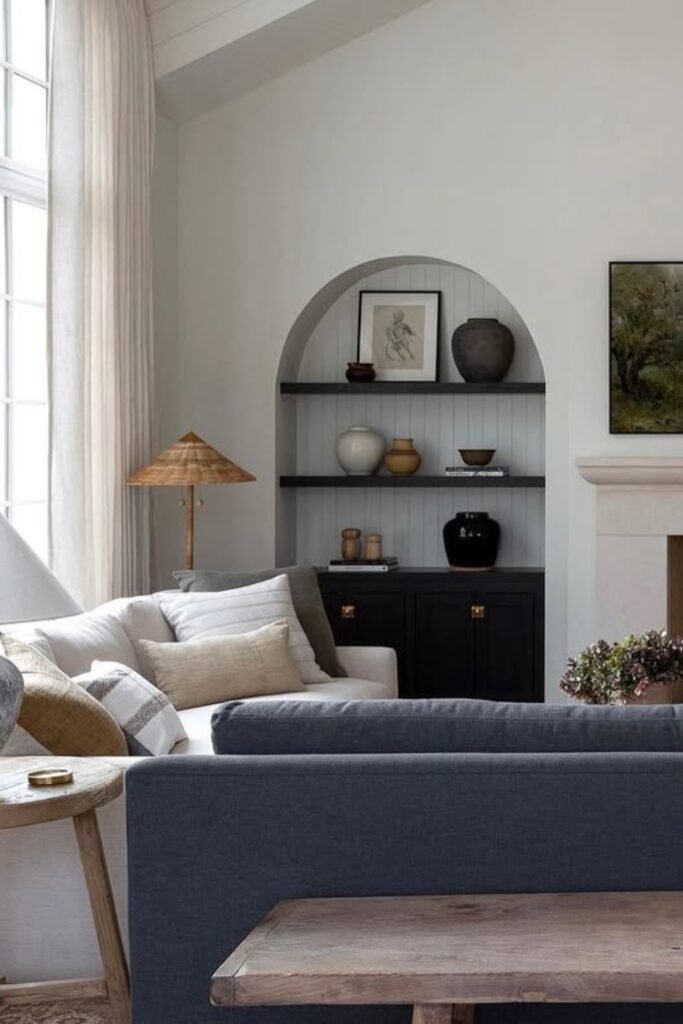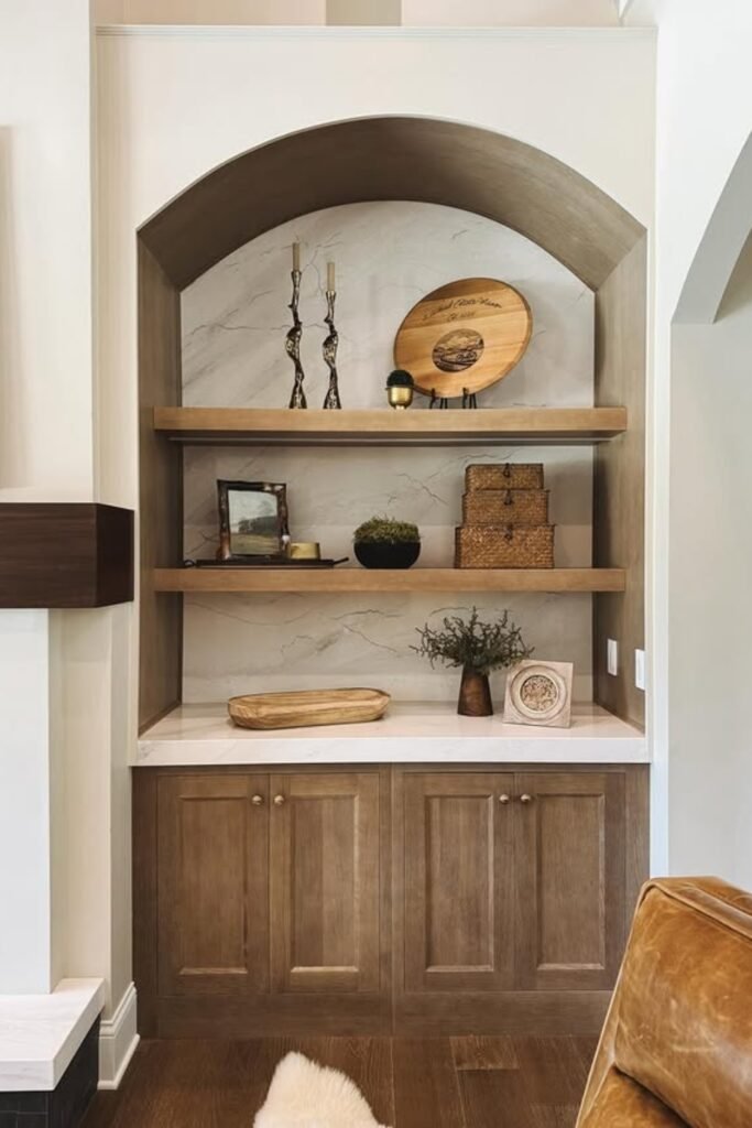 The arched shelving adds depth and character, while curated decor brings balance and charm.