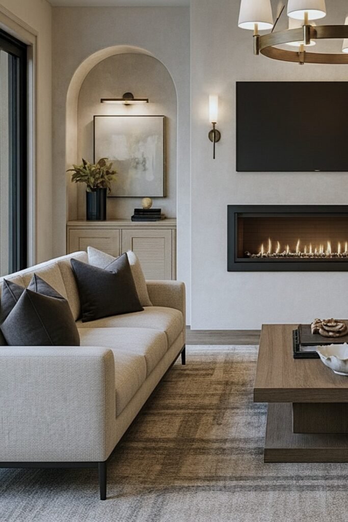 The sleek fireplace adds a soft glow, while neutral tones and layered textures create a calm, inviting feel.