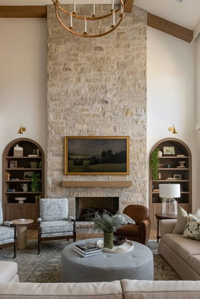 This elegant living room combines rustic stone textures with refined architectural details.