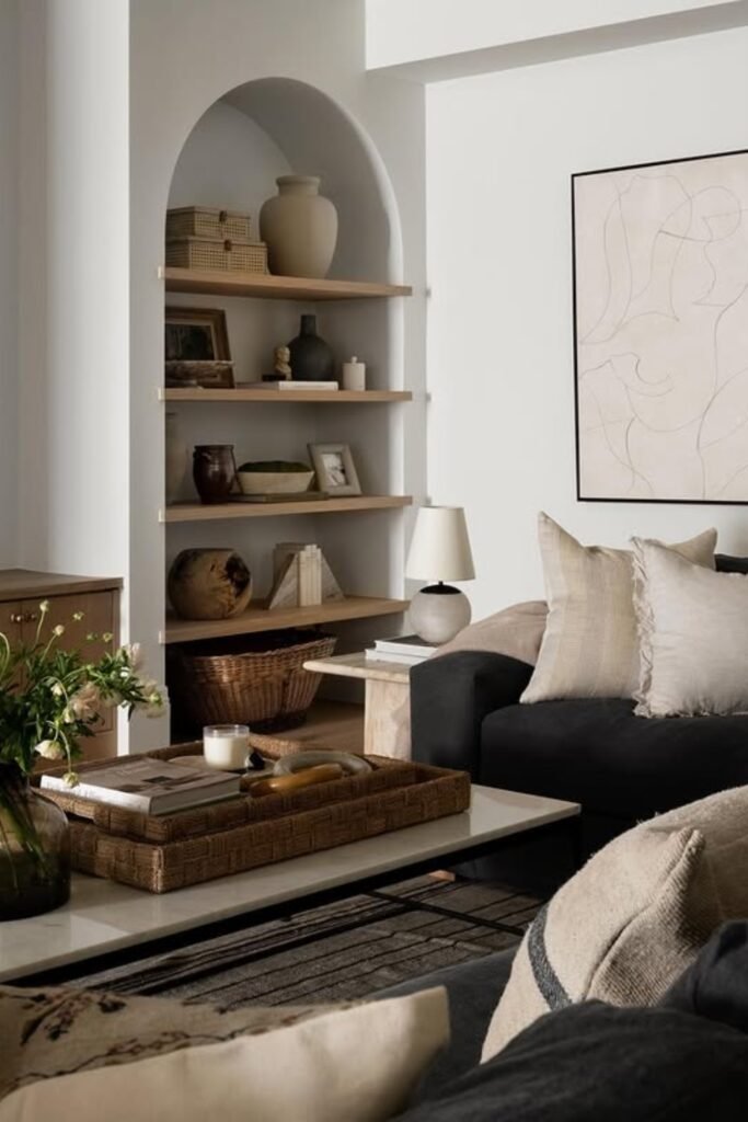 The arched shelving adds depth and character, while layered decor and woven elements bring warmth.