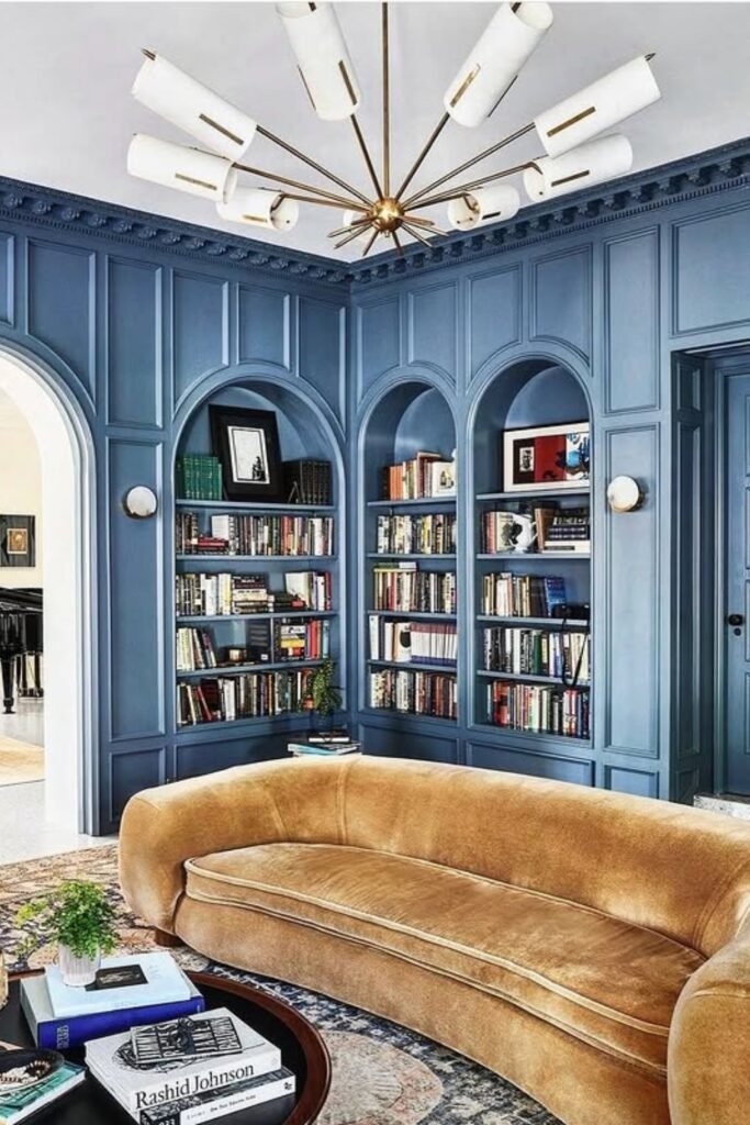 This striking space pairs rich blue paneling with a warm velvet sofa for a dramatic yet inviting feel.