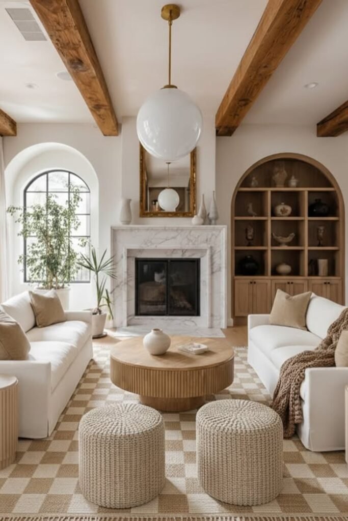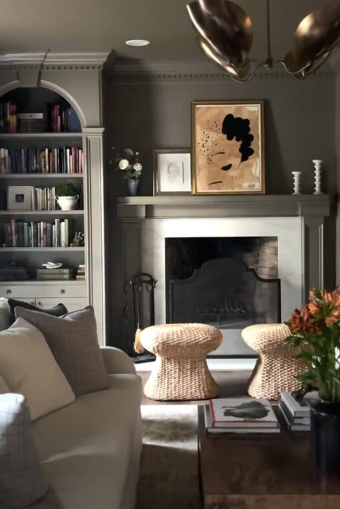 Built-in shelving and classic architectural details add structure, while warm textures like woven stools and wood accents bring balance.