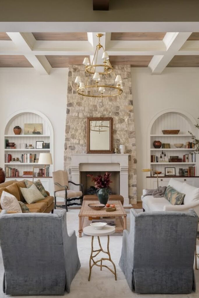 Symmetrical built-ins and soft furnishings create balance, while warm wood accents and layered decor add depth.