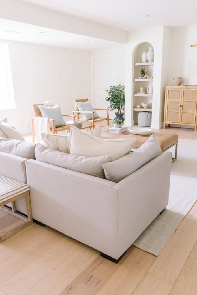 This serene living space highlights soft textures and layered neutrals for a relaxed, inviting feel.