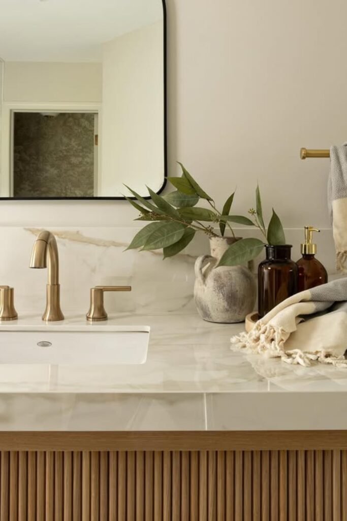 You can make your bathroom feel calm and grounded with soft beige walls and a fluted wood vanity.