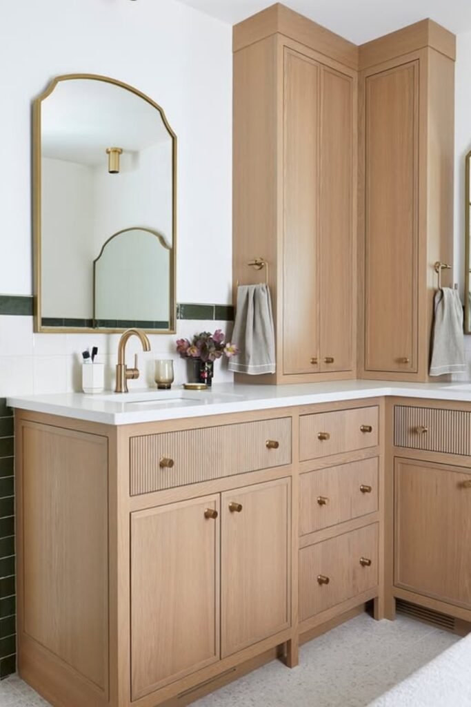 You will instantly warm up your bathroom corner with light oak cabinetry and brass fixtures.