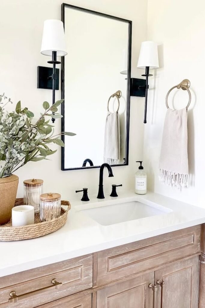 You can keep your bathroom organized and cozy using a woven tray for essentials. Pair a warm wood vanity with matte black fixtures to create visual contrast.