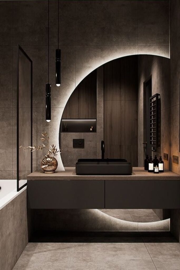 You can make your bathroom feel dramatic and high-end with backlit mirrors and moody walls.