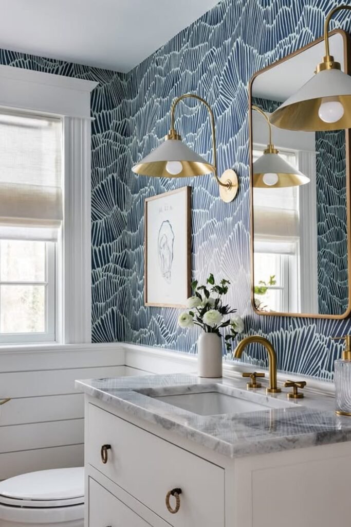 You can transform a small bathroom with bold blue wallpaper that doesn’t feel crowded.