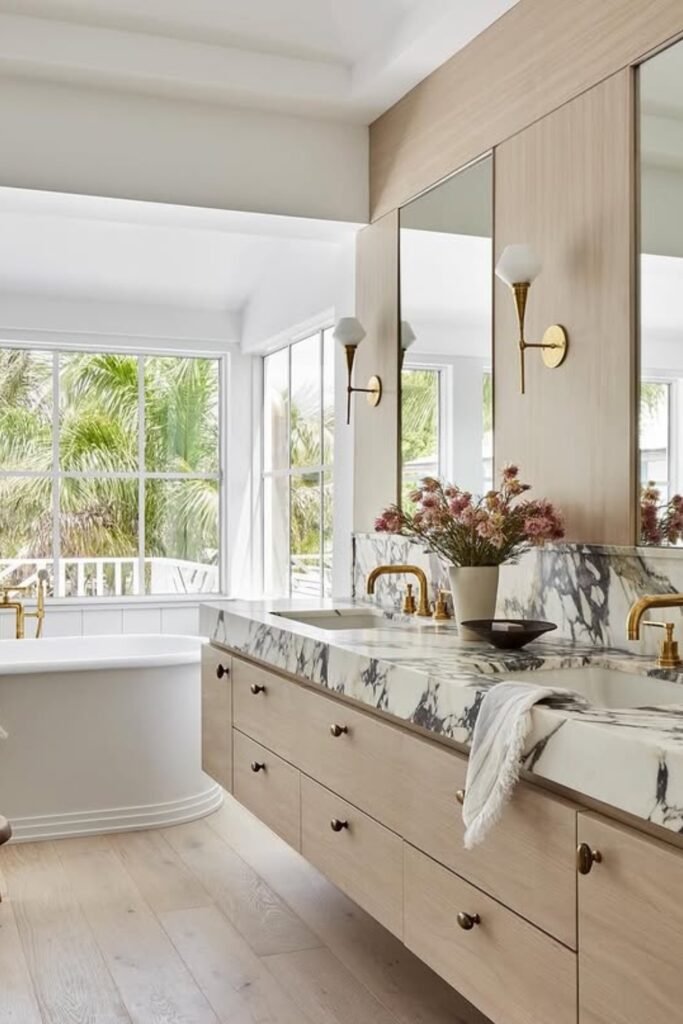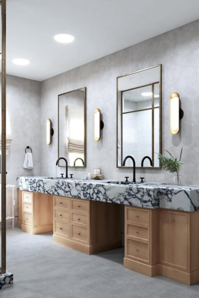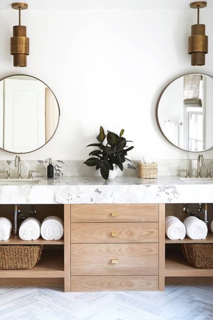 It pairs a marble countertop with brass pendants and round mirrors, and you instantly create a calm, spa-inspired look.