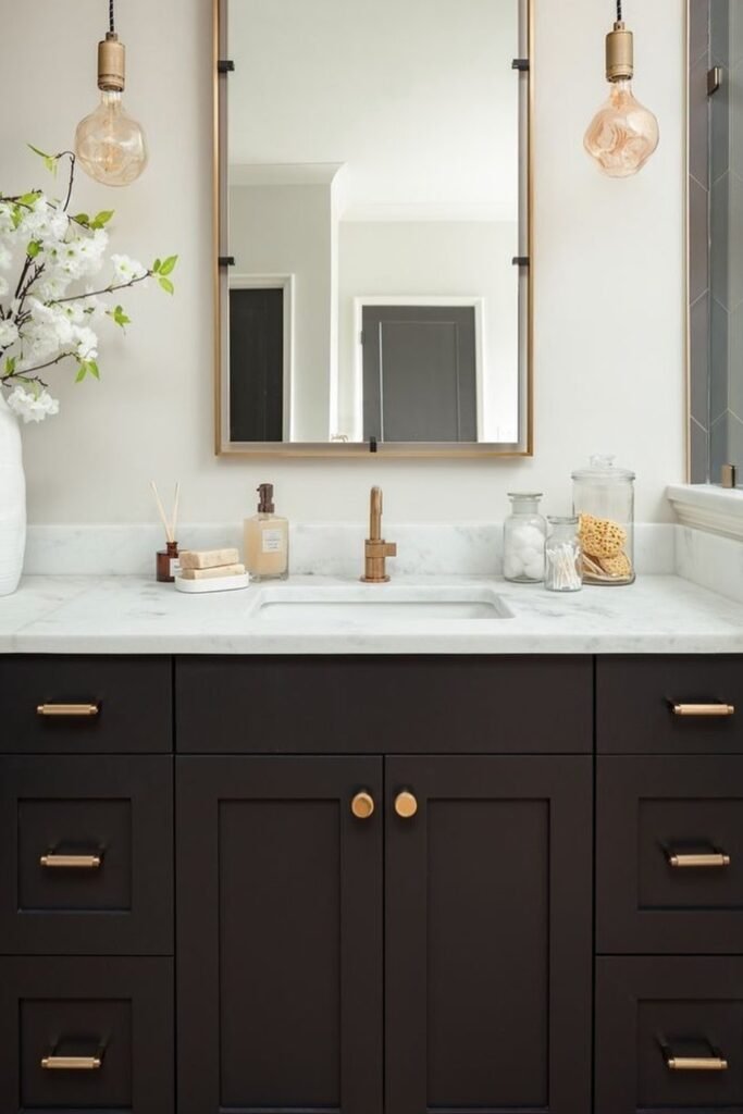 You can anchor your bathroom with dark cabinetry and brass accents. Soft pendant lights and a marble top add elegance, and placing a tall vase of white blooms gives the setup height.