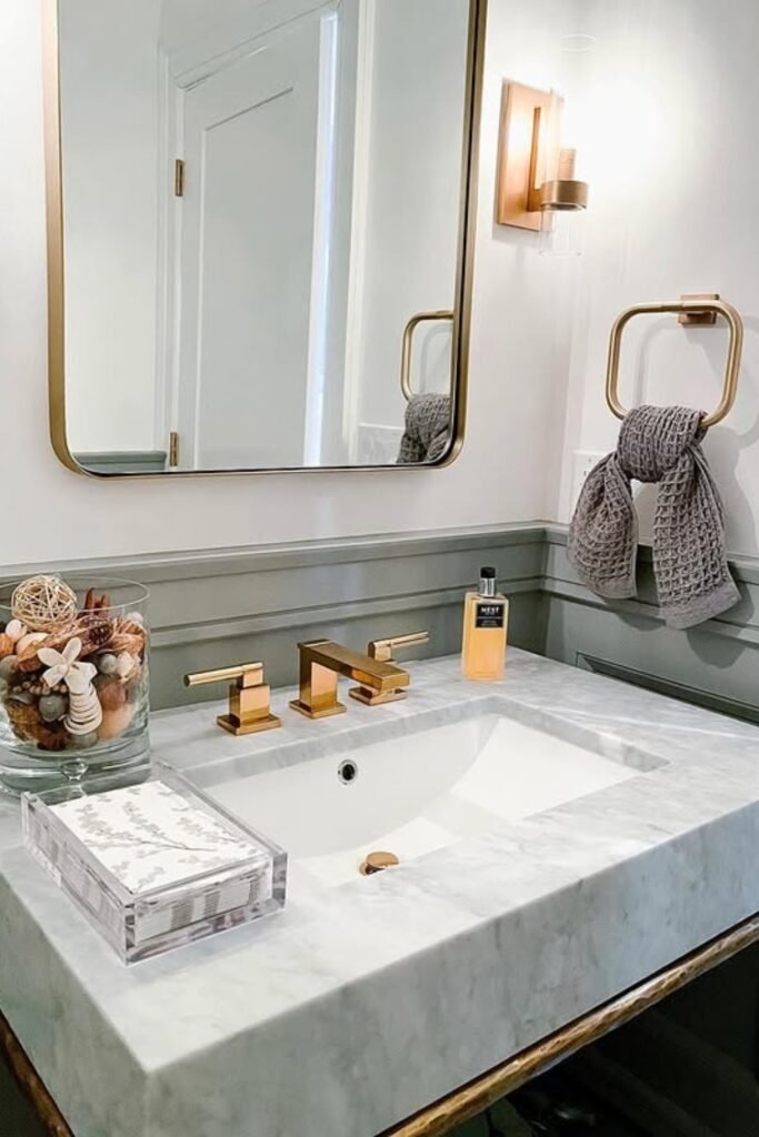 The dramatic marble countertop paired with your brass fixtures that adds the instant sophistication without feeling cold.
