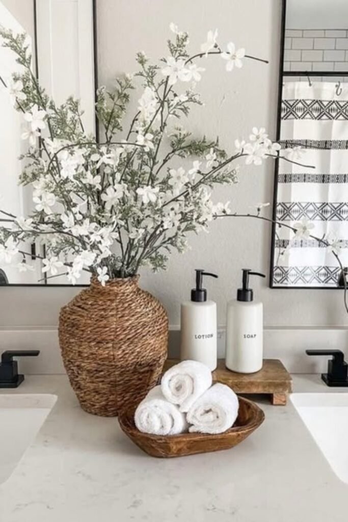 A woven vase filled with white blooms adds height and softness, while matching soap bottles and a small wooden bowl help you keep everything organized and visually balanced.