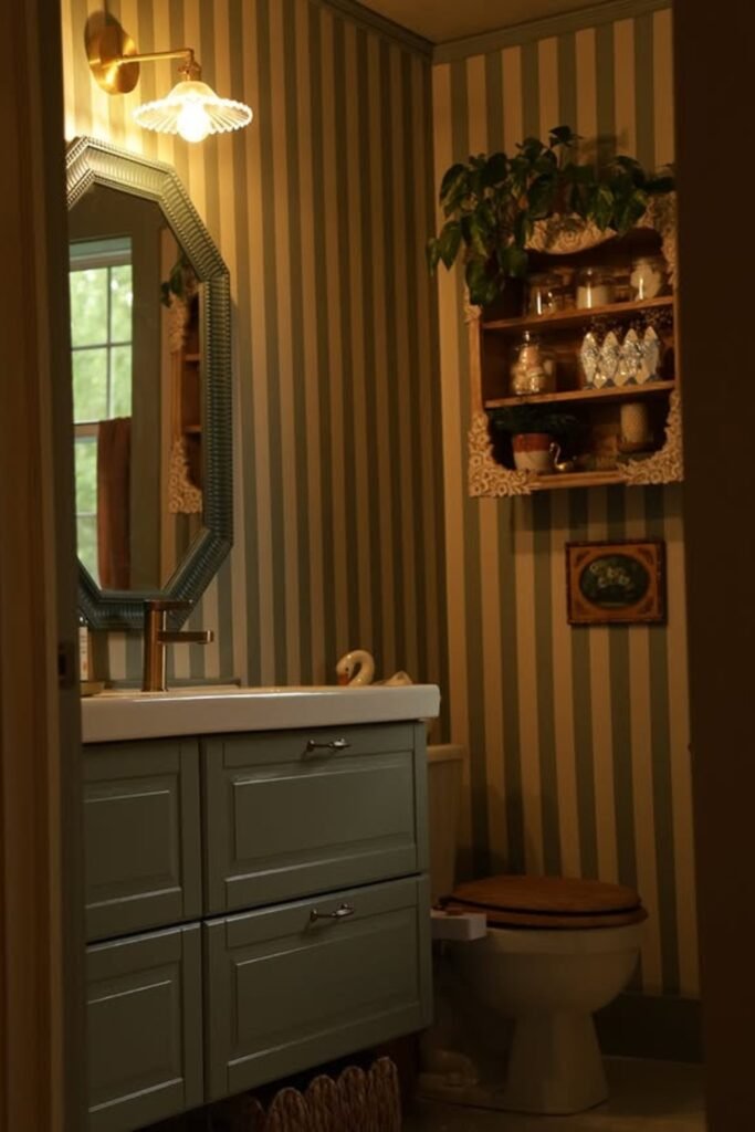 You can bring nostalgic charm into your bathroom with soft lighting, striped wallpaper, and warm brass accents.