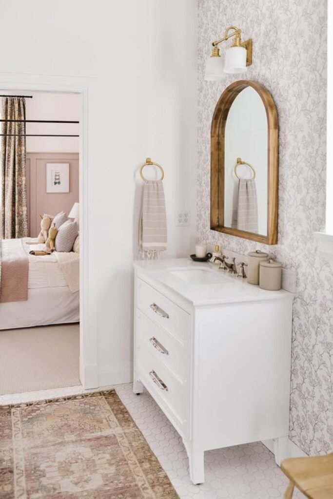 A warm arch mirror and floral wallpaper create your seamless connection between this bathroom and the adjoining bedroom.