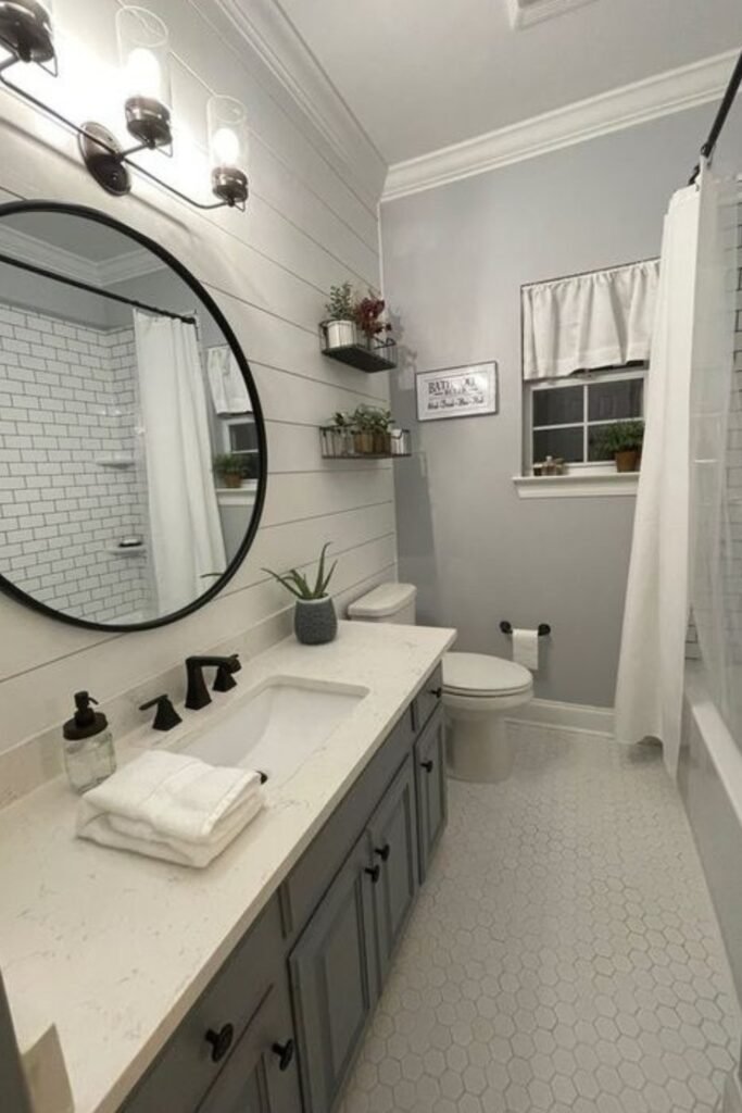 You can create a cozy farmhouse vibe with shiplap walls, a round mirror, and matte black hardware.