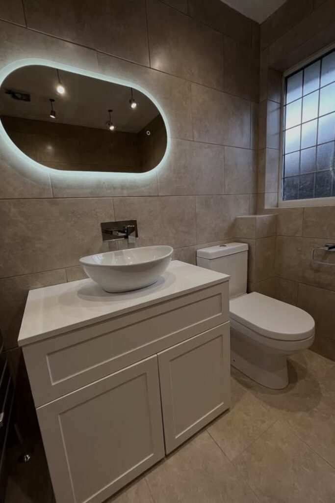 You might be surprised how much a backlit mirror can transform your bathroom. That soft LED glow outlines the oval shape, adding both depth and brightness, no extra fixtures needed.