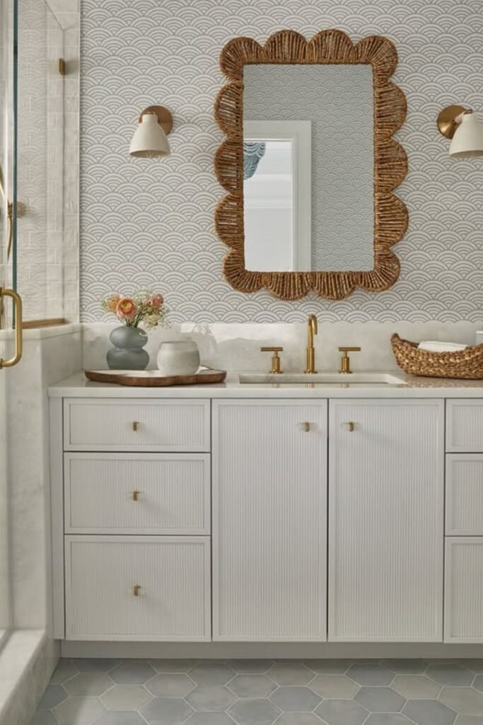 This scalloped wicker design warms up your patterned walls with cozy, coastal charm. It’s perfect for light or neutral bathrooms that need texture and personality without adding clutter.