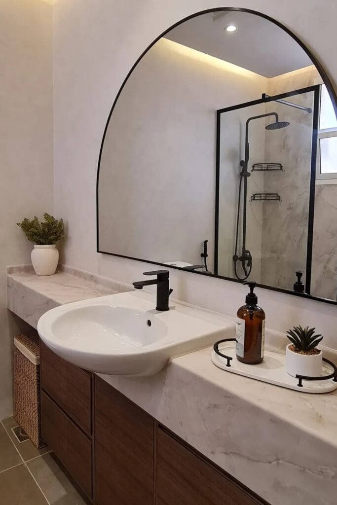 You can instantly soften your modern bathroom with an arched mirror like this. It’s the perfect setup if your home leans minimal but you still want some personality.