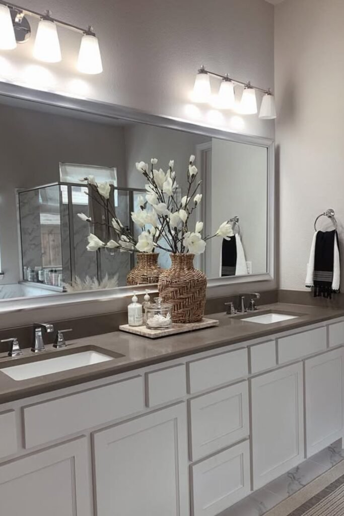 It opens up the space, brightens the room, and creates perfect symmetry. It’s ideal for wide layouts or shared bathrooms where two mirrors would break your flow.