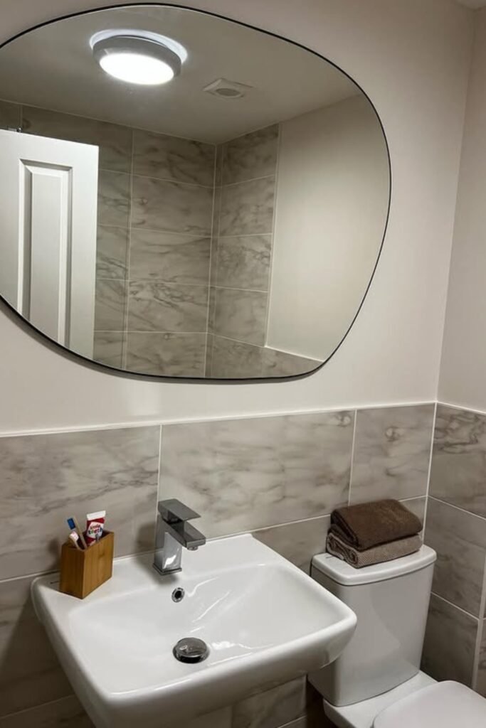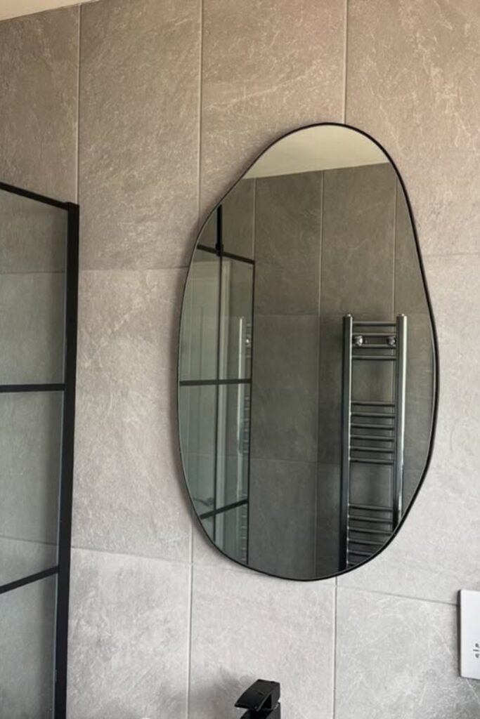 To bring the look home, you can pick a blob-style mirror with a thin black edge and pair it with matte black fixtures to keep everything cohesive and modern.