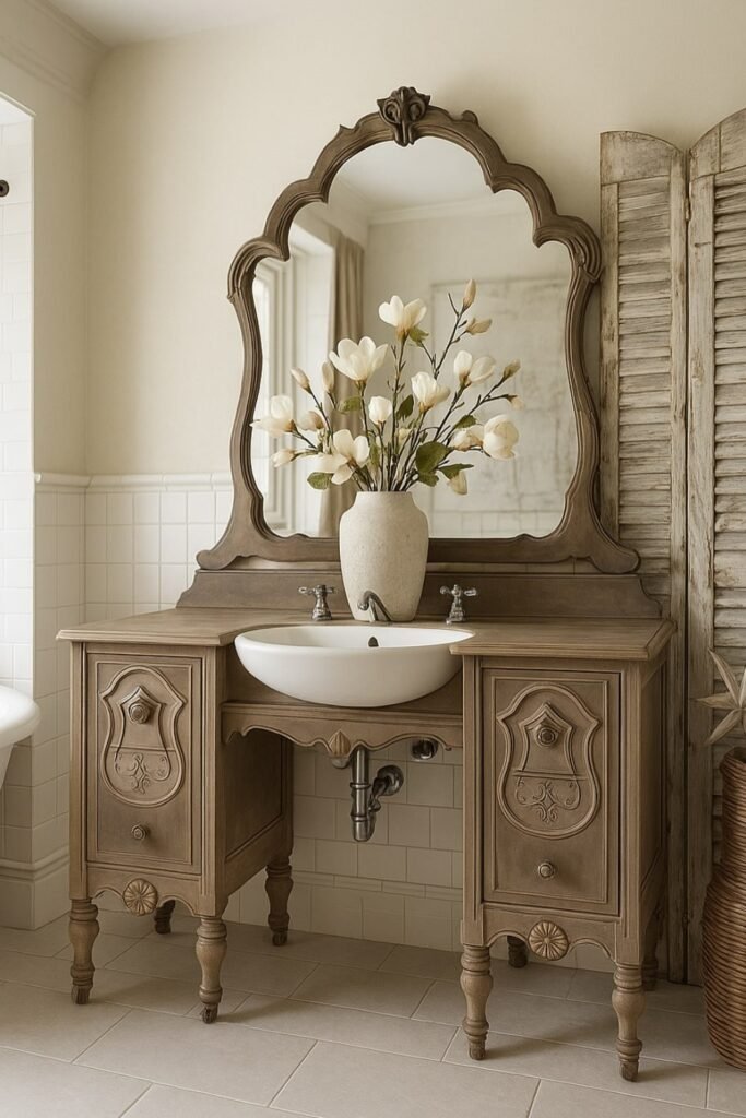 You can bring instant warmth to a neutral bathroom with a carved wooden mirror.