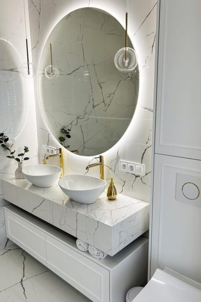 You can’t go wrong with this modern-luxury pairing, a backlit oval mirror, marble vanity, and golden faucets that feel straight out of a boutique hotel.