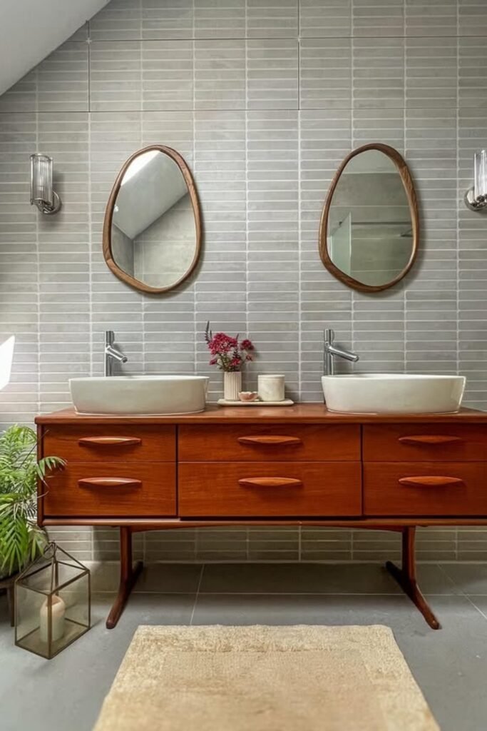 The mismatched organic mirrors add movement above your teak vanity, while warm wood tones instantly soften the cool gray tile backdrop.