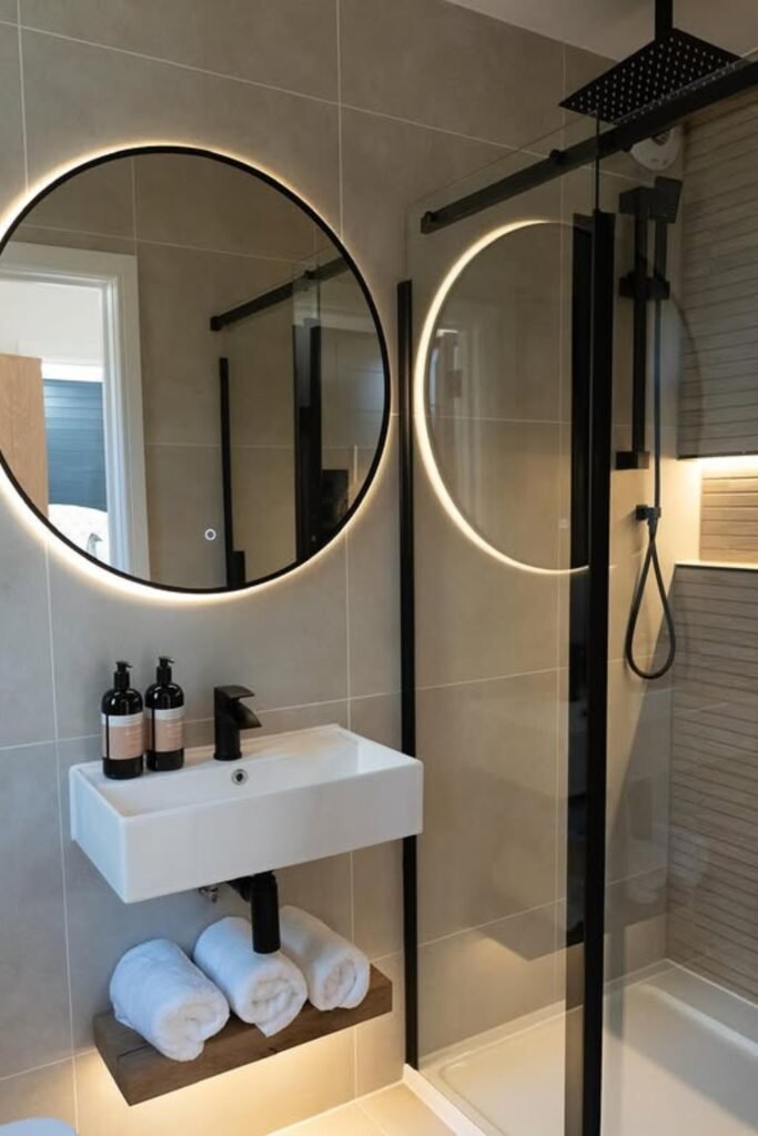 It ties perfectly with black shower trim, creating a clean, hotel-inspired vibe. It’s ideal for compact or guest bathrooms where you need both style and function.